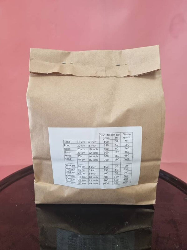 | Grote (bij hoogte 10 cm) | aantal personen | Biscuitmix (gr) | water (ml) | eieren (gr) |