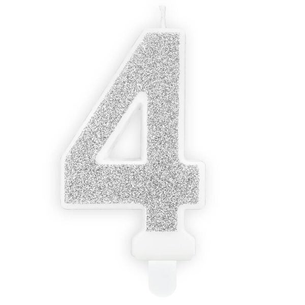 Deze zilveren verjaardagskaars 4 van PartyDeco is perfect voor je verjaardagstaart.